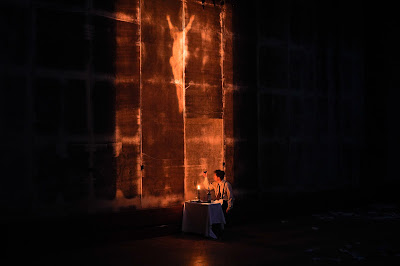 At the end of the performance, when the curator who had managed to take the painting outside came and sat down with his small table under the wall that the painting had vacated. The silhouette of Jesus in the painting appears on the wall through the light, in the same position as in the painting; Jesus is now a ghost in the hall.